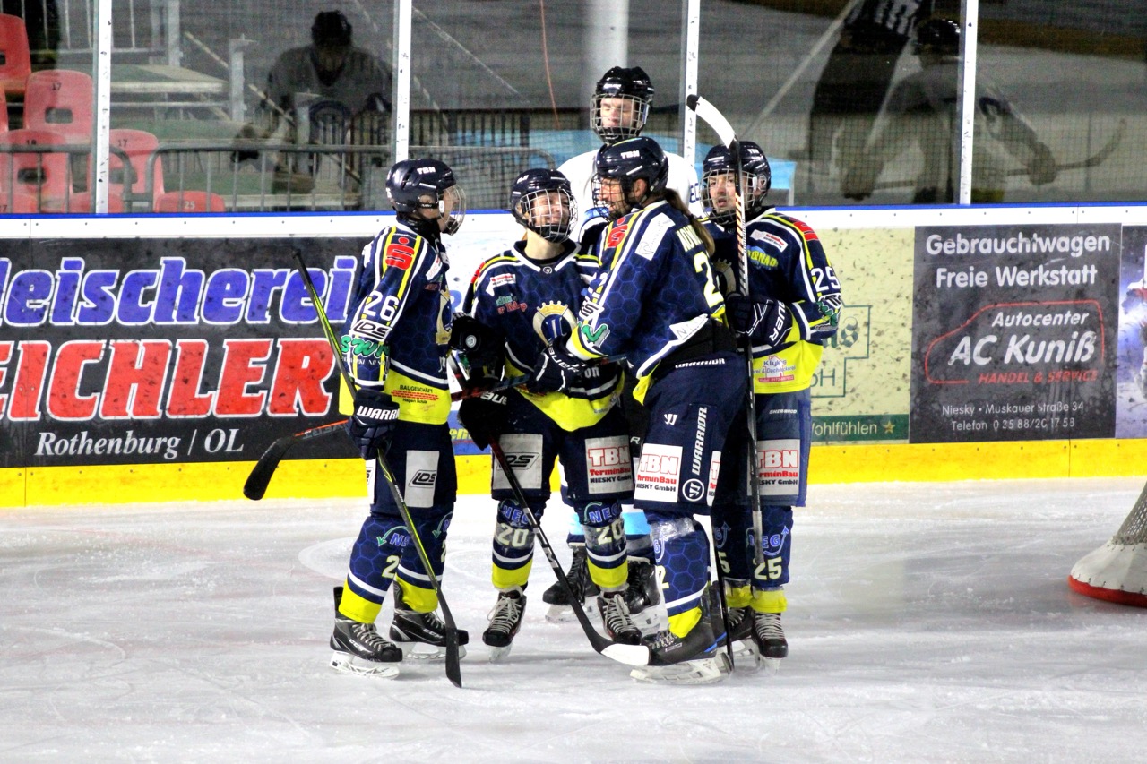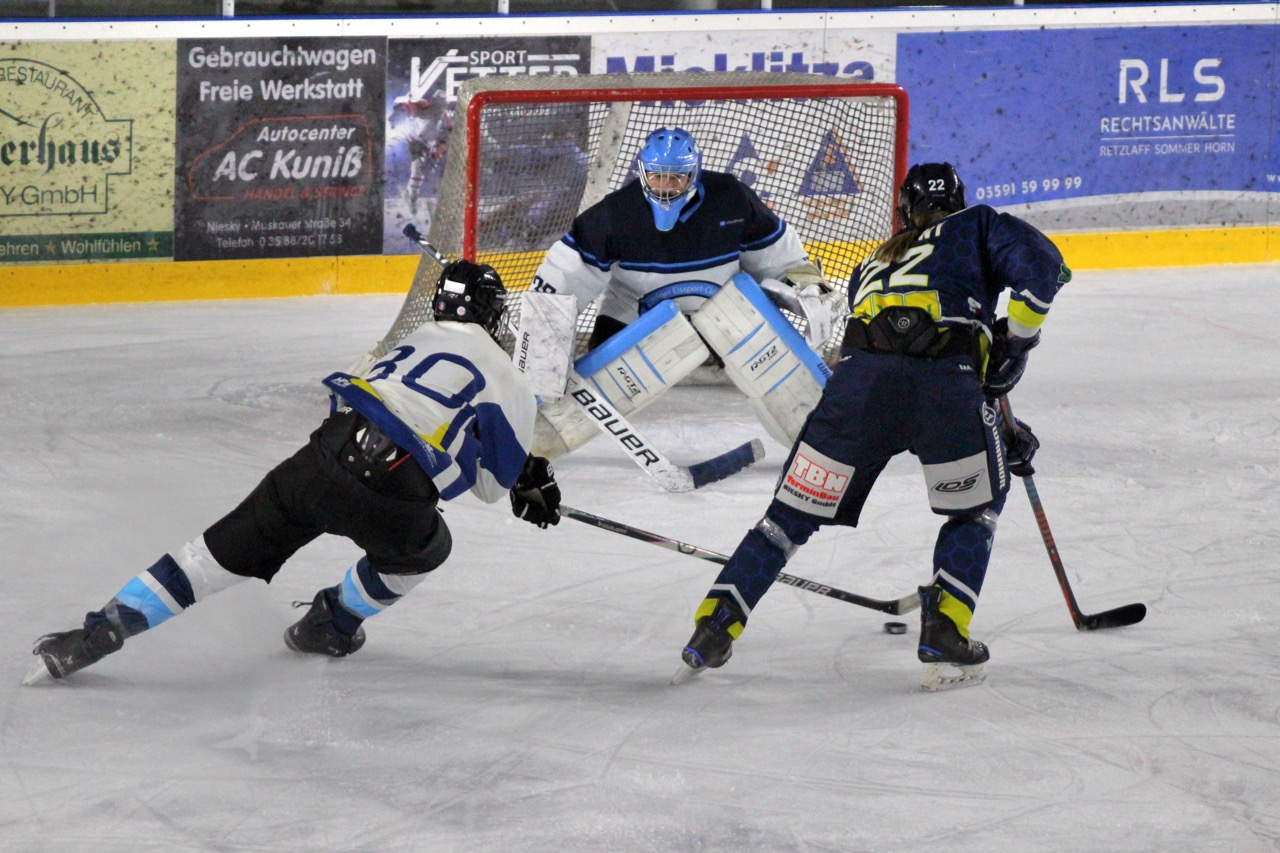 Auch im zweiten Drittel änderte sich das Bild nicht. In der 23. Minute verwandelte Nick Bolze einen Penalty nach vorherigem Foul souverän zum 6:0. Nur eine Minute später schnürte Falk Perschmann mit seinem zweiten Treffer des Abends den Doppelpack zum 7:0. In der 32. Minute setzte Lea Glossmann mit einem sehenswerten Treffer nach Vorlagen von Fritz Krujatz und Alexander Henschel das 8:0.