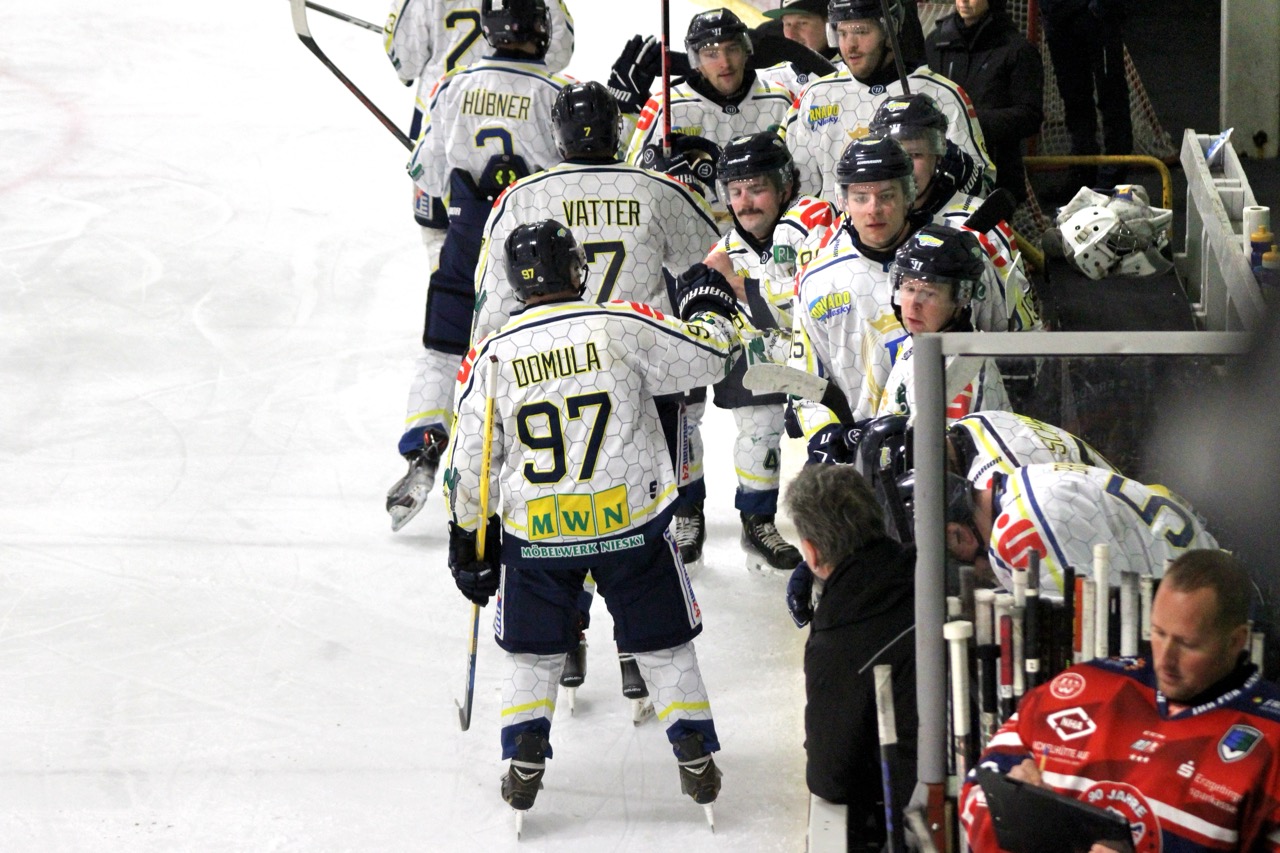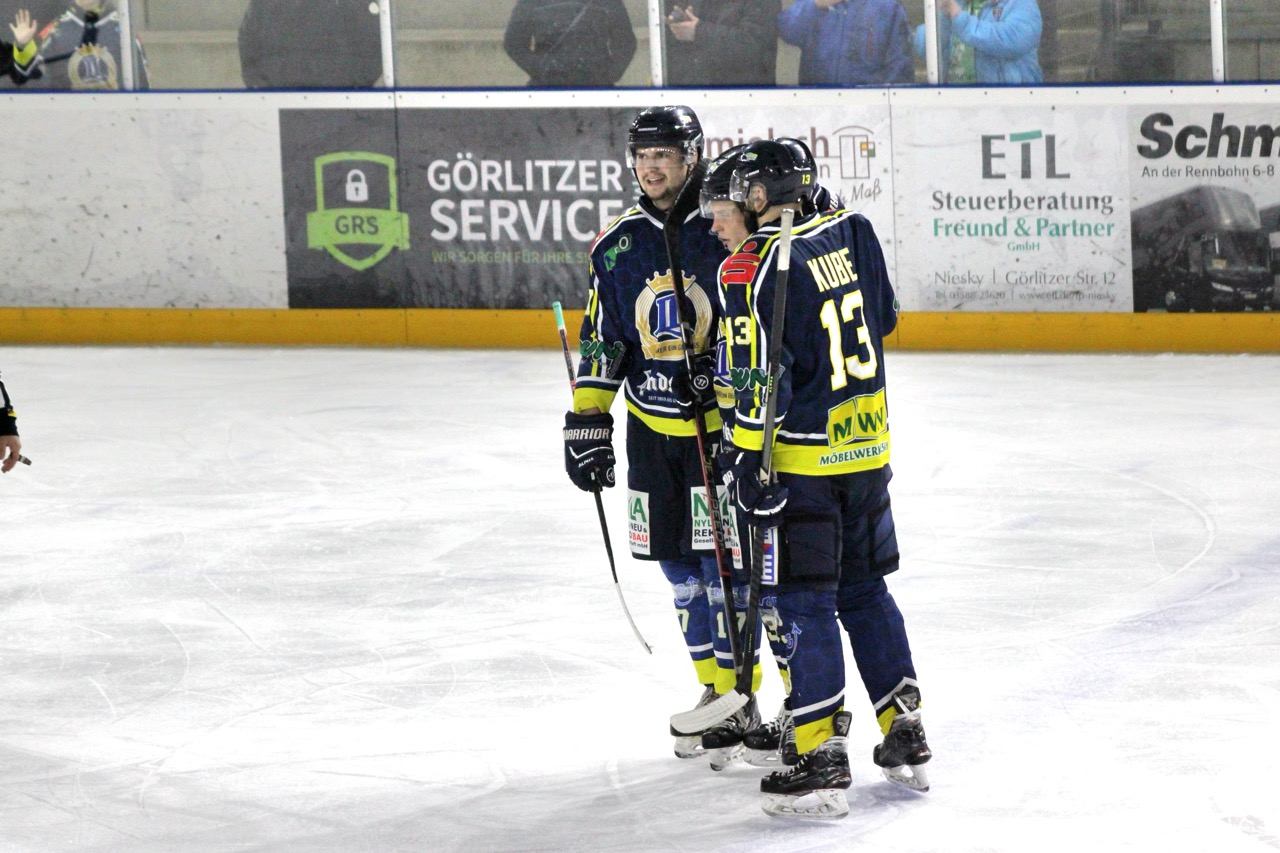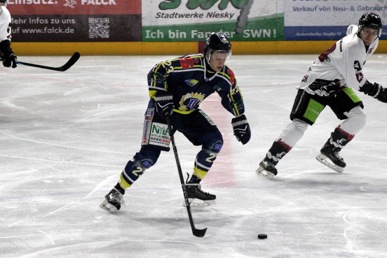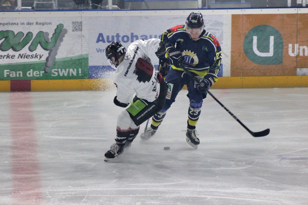 Beide Mannschaften begannen zunächst vorsichtig, ohne großes Risiko zu gehen. Dennoch nutzten die Gäste ihre erste Gelegenheit konsequent: In der 9. Minute traf Sebastian Hoffmann zur 0:1-Führung der Huskies, vorbereitet von Garwin Stewart. Die Nieskyer antworteten jedoch schnell. Thomas Meißner stellte in der 11. Minute nach Vorlage von Moritz Wolfram auf 1:1. Kurz vor der ersten Pause belohnte sich die Reserve für ihren zunehmenden Druck: Nick Bolze erzielte in der 19. Minute das 2:1 und drehte damit das Spiel zugunsten des Heimteams.
